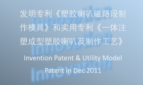 音度电声厂2011年12月2日向国家专利局申请发明专利《塑胶喇叭磁路段制作模具》申请:201120574802.5;实用专利《一体注塑成型塑胶喇叭及制作工艺》专利号:201110459216.0,改进了喇叭传统制作工艺流程。