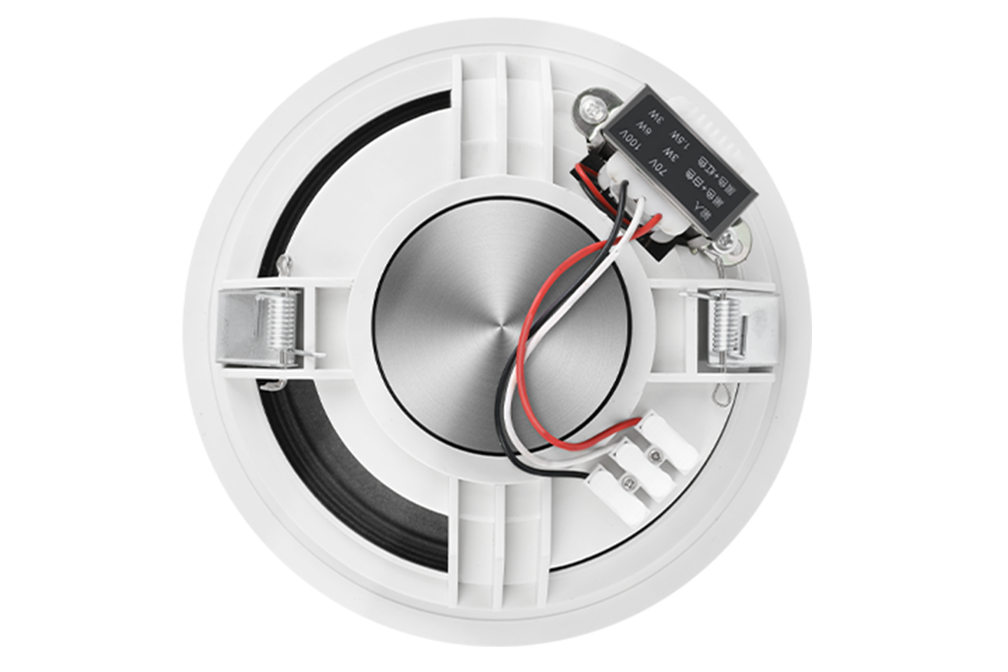 天花喇叭,又名吸顶喇叭,公共广播系统中重要的一员,是一种安装在天花板上的电声转换器件。用来将扩音机输入的音频电功率信号转换成声功率信号,以声波的方式辐射到需要供声的空间。一般用于公共场所,以定压方式输入音频功率信号,也有空间不太大的场所。例如酒店、工厂、学校、商场、超市、会所、别墅等各种场所,作为背景音乐、消防广播、寻呼广播、公共广播等。
