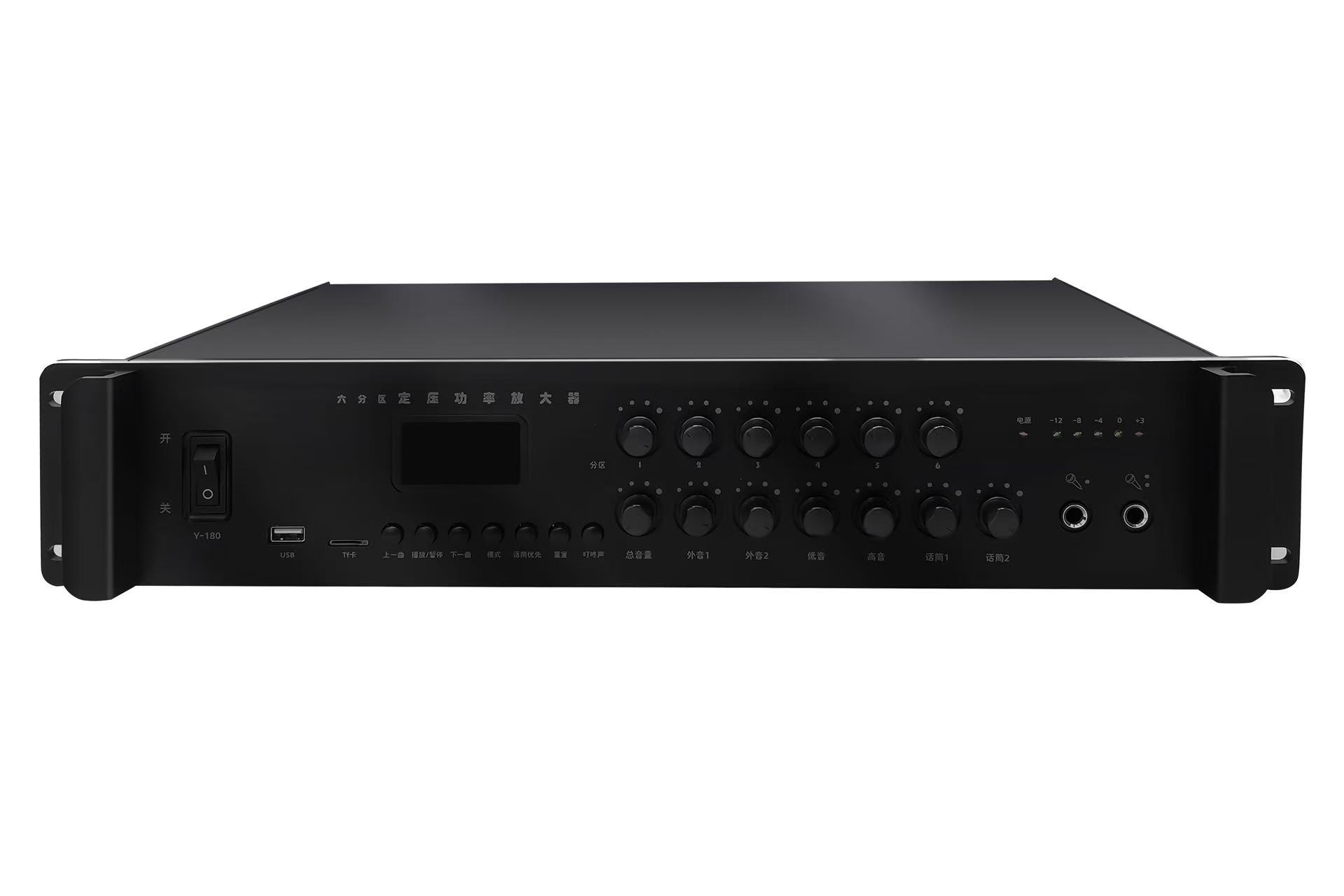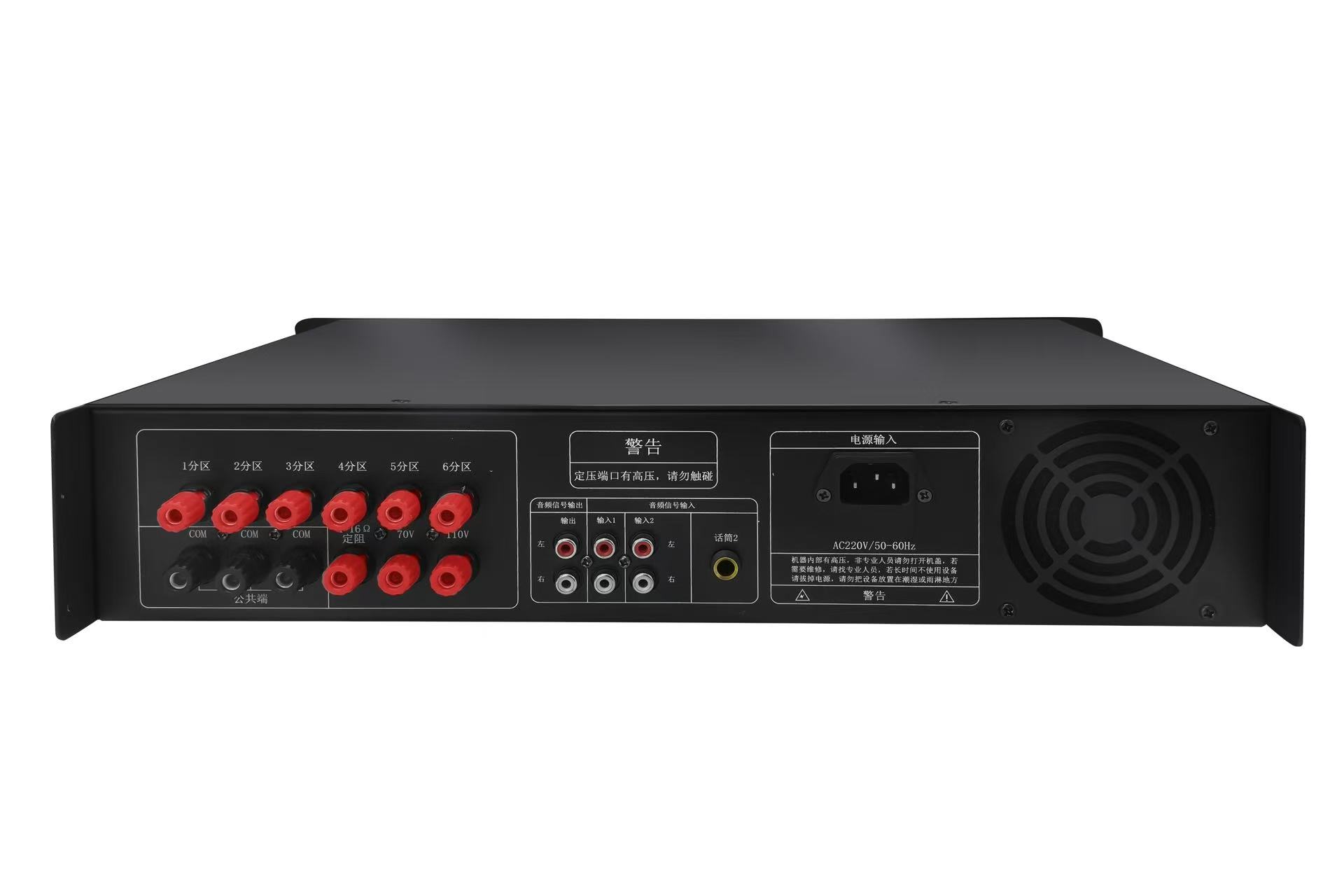 1、6组定压输出(100V)独立6分区调节输出,一路定阻输出(4-16Ω),一路定压输出(70V),一路定压输出(100V)2、话筒优先开关功能3、录音/重放功能4、支持USB播放,三组RCA信号输入,一组RCA前置输出5、高低音调节技术参数1、使用电源:AC220V-240V 50Hz2、频率响应:20-20KHz3、信噪比:≥80DB4、谐波失真:≤0.5%5、输入灵敏度:550mV6、高音调节:±14dB(10KHz)7、低音调节:±14DB(100Hz)