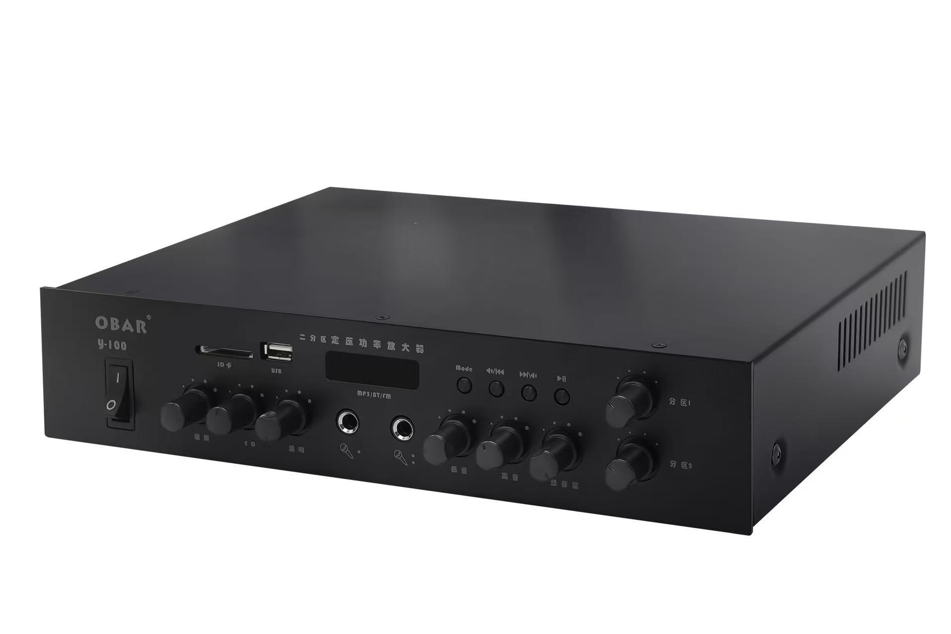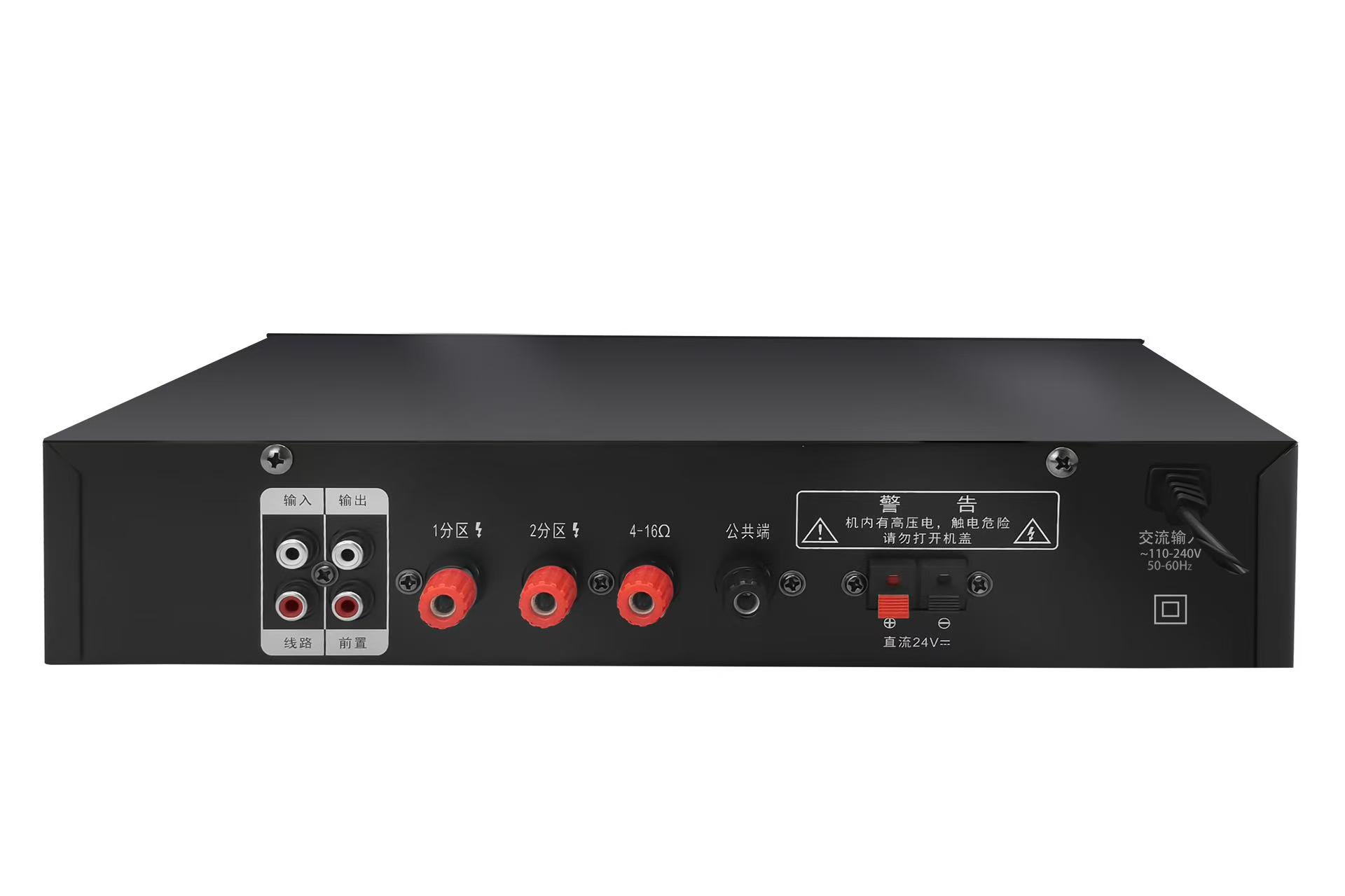 1、2组定压输出(100V)独立2分区调节输出,一路定阻输出(4-16Ω)2、内置FM、蓝牙功能3、话筒混响调节4、支持USB播放,一组RCA信号输入,一组RCA前置输出5、高低音调节技术参数1、使用电源:AC220V-240V 50Hz2、频率响应:20-20KHz3、信噪比:≥76DB4、谐波失真:≤0.3%5、输入灵敏度:550mV6、高音调节:±10dB(10KHz)7、低音调节:±10dB(100Hz)