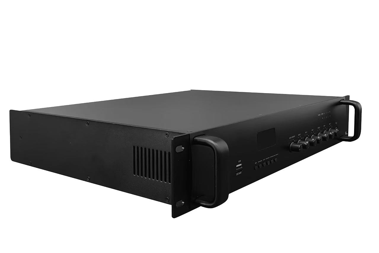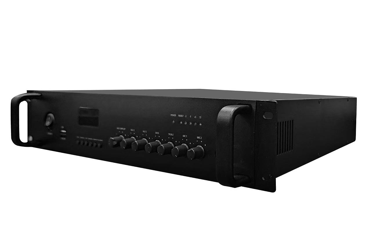 YS250 | 250W | 1、一路定压输出(70V),一路定压输出(100V) 一路定阻输出(4-16Ω) 2、话筒优先开关功能 3、录音/重放功能 4、支持USB播放,三组RCA信号输入,一组RCA前置输出 5、高低音调节 技术参数 1、使用电源:AC220V-240V 50Hz 2、频率响应:20-20KHz 3、信噪比:≥80dB 4、谐波失真:≤1% 5、输入灵敏度:550mV 6、高音调节:±14dB(10KHz) 7、低音调节:±14DB(100Hz) |