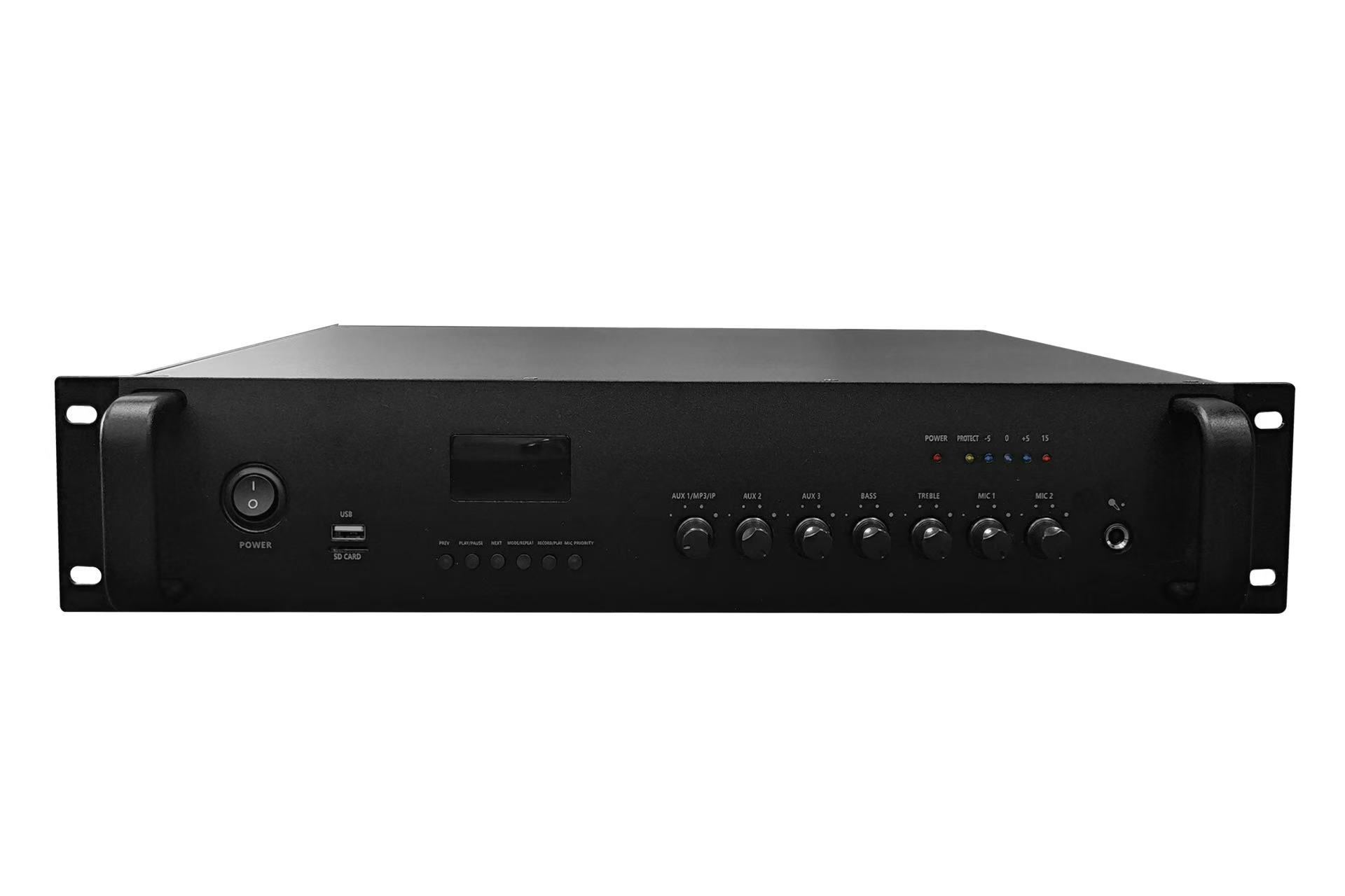 YS80 | 80W | 1、一路定压输出(70V),一路定压输出(100V) 一路定阻输出(4-16Ω) 2、话筒优先开关功能 3、录音/重放功能 4、支持USB播放,三组RCA信号输入,一组RCA前置输出 5、高低音调节 技术参数 1、使用电源:AC220V-240V 50Hz 2、频率响应:20-20KHz 3、信噪比:≥80dB 4、谐波失真:≤1% 5、输入灵敏度:550mV 6、高音调节:±14dB(10KHz) 7、低音调节:±14DB(100Hz) |