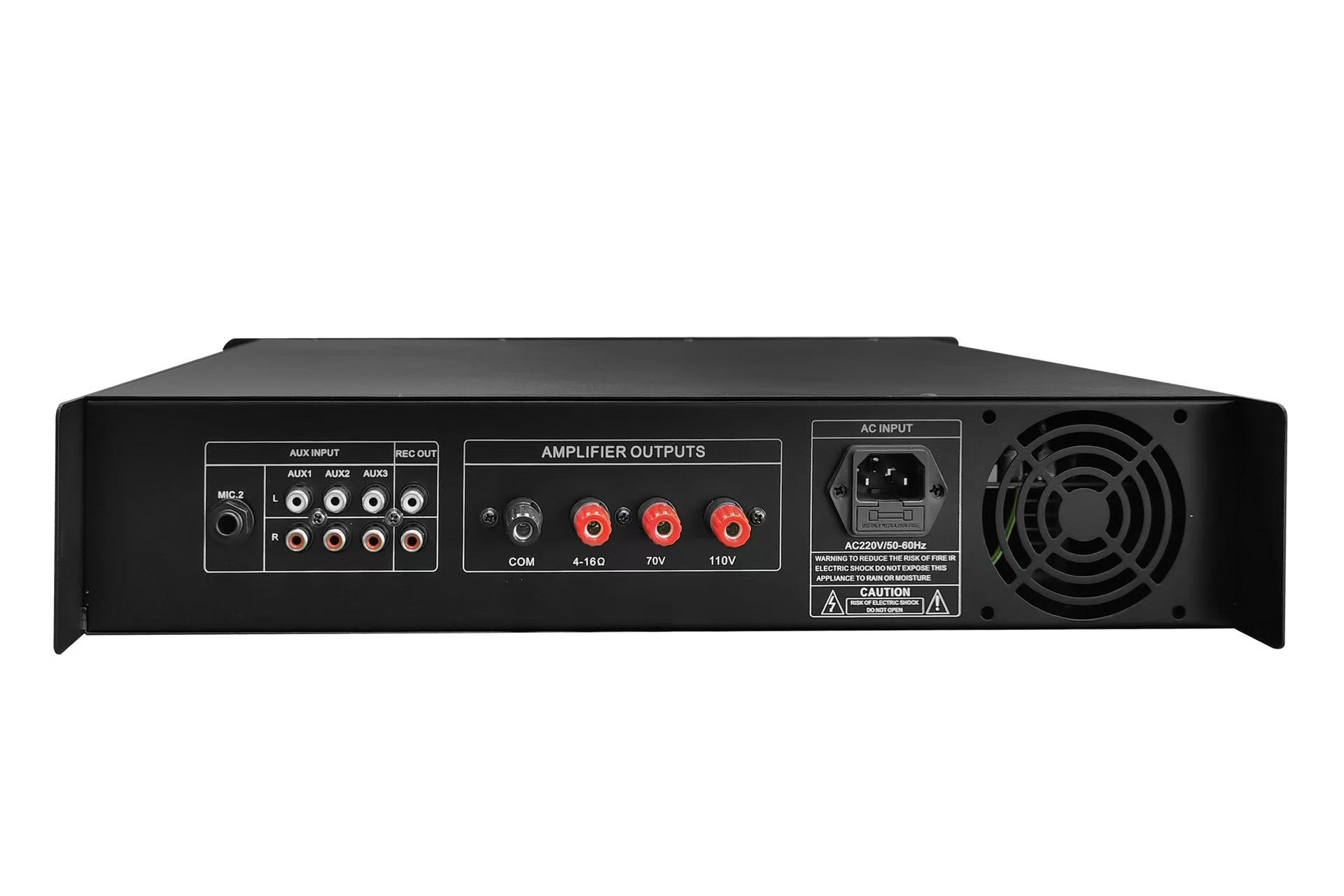 S650 | 650W | 1、一路定压输出(70V),一路定压输出(100V) 一路定阻输出(4-16Ω) 2、话筒优先开关功能 3、录音/重放功能 4、支持USB播放,三组RCA信号输入,一组RCA前置输出 5、高低音调节 技术参数 1、使用电源:AC220V-240V 50Hz 2、频率响应:20-20KHz 3、信噪比:≥80dB 4、谐波失真:≤1% 5、输入灵敏度:550mV 6、高音调节:±14dB(10KHz) 7、低音调节:±14DB(100Hz) |
