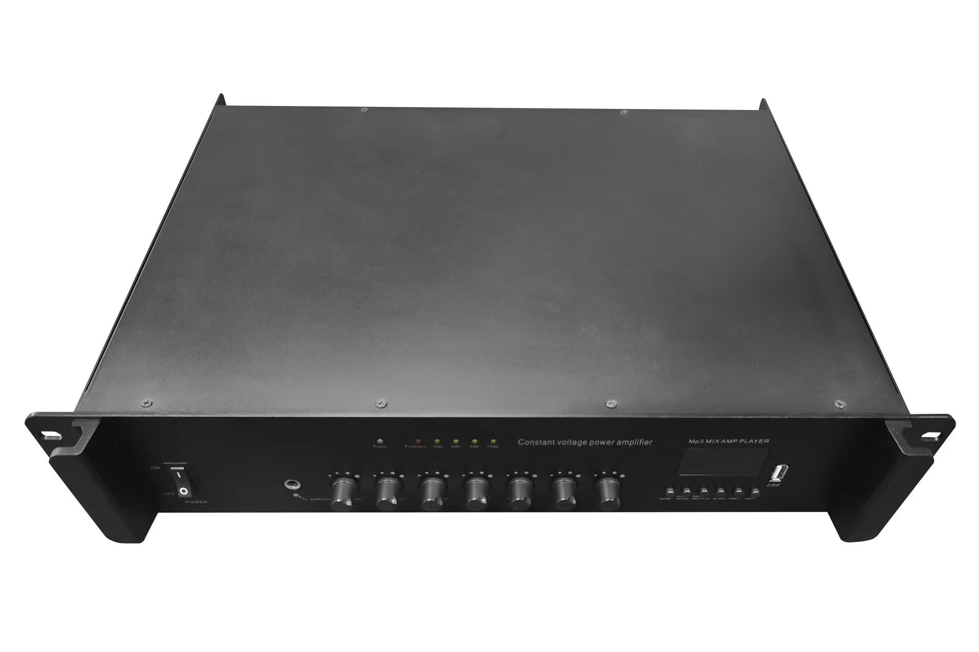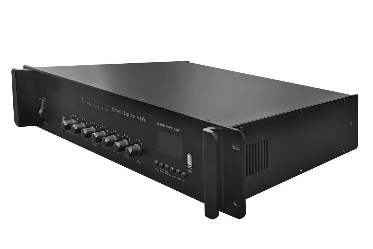 S120 | 120W | 1、一路定压输出(70V),一路定压输出(100V) 一路定阻输出(4-16Ω) 2、话筒优先开关功能 3、录音/重放功能 4、支持USB播放,三组RCA信号输入,一组RCA前置输出 5、高低音调节 技术参数 1、使用电源:AC220V-240V 50Hz 2、频率响应:20-20KHz 3、信噪比:≥80dB 4、谐波失真:≤1% 5、输入灵敏度:550mV 6、高音调节:±14dB(10KHz) 7、低音调节:±14DB(100Hz) |