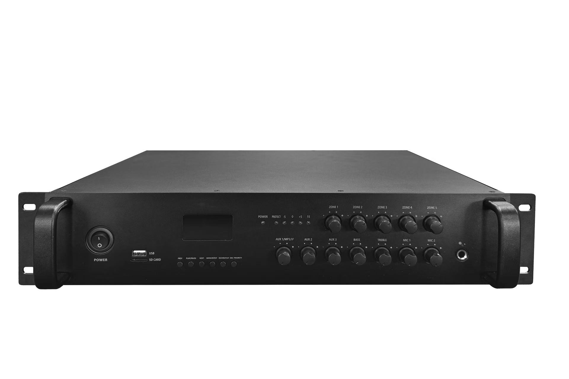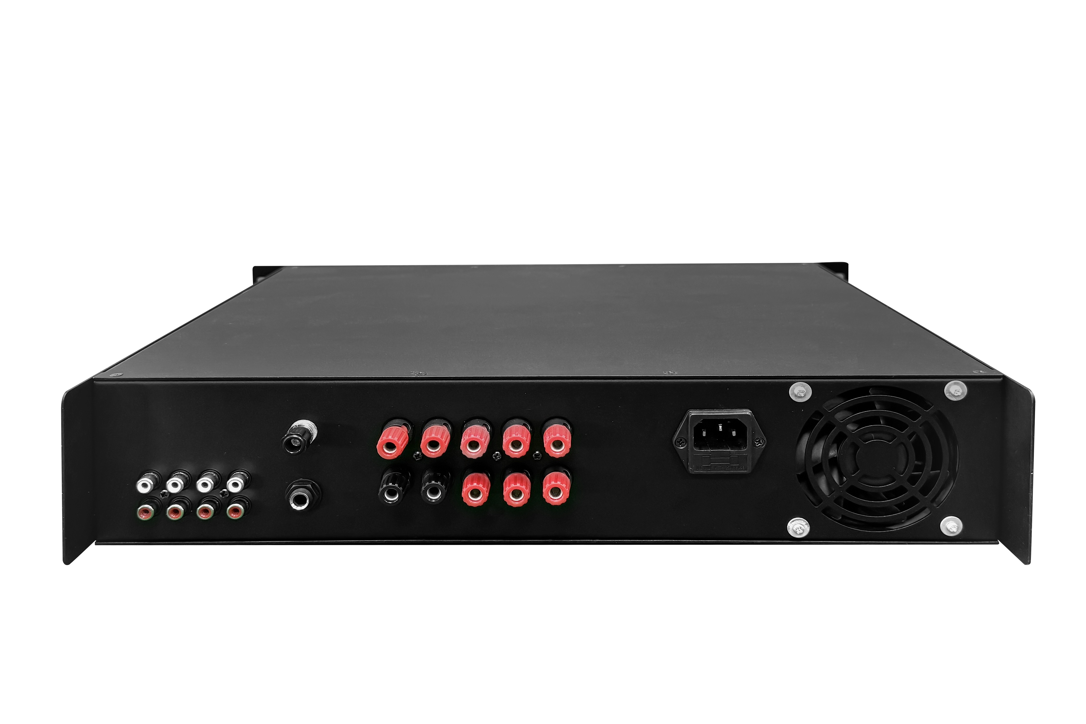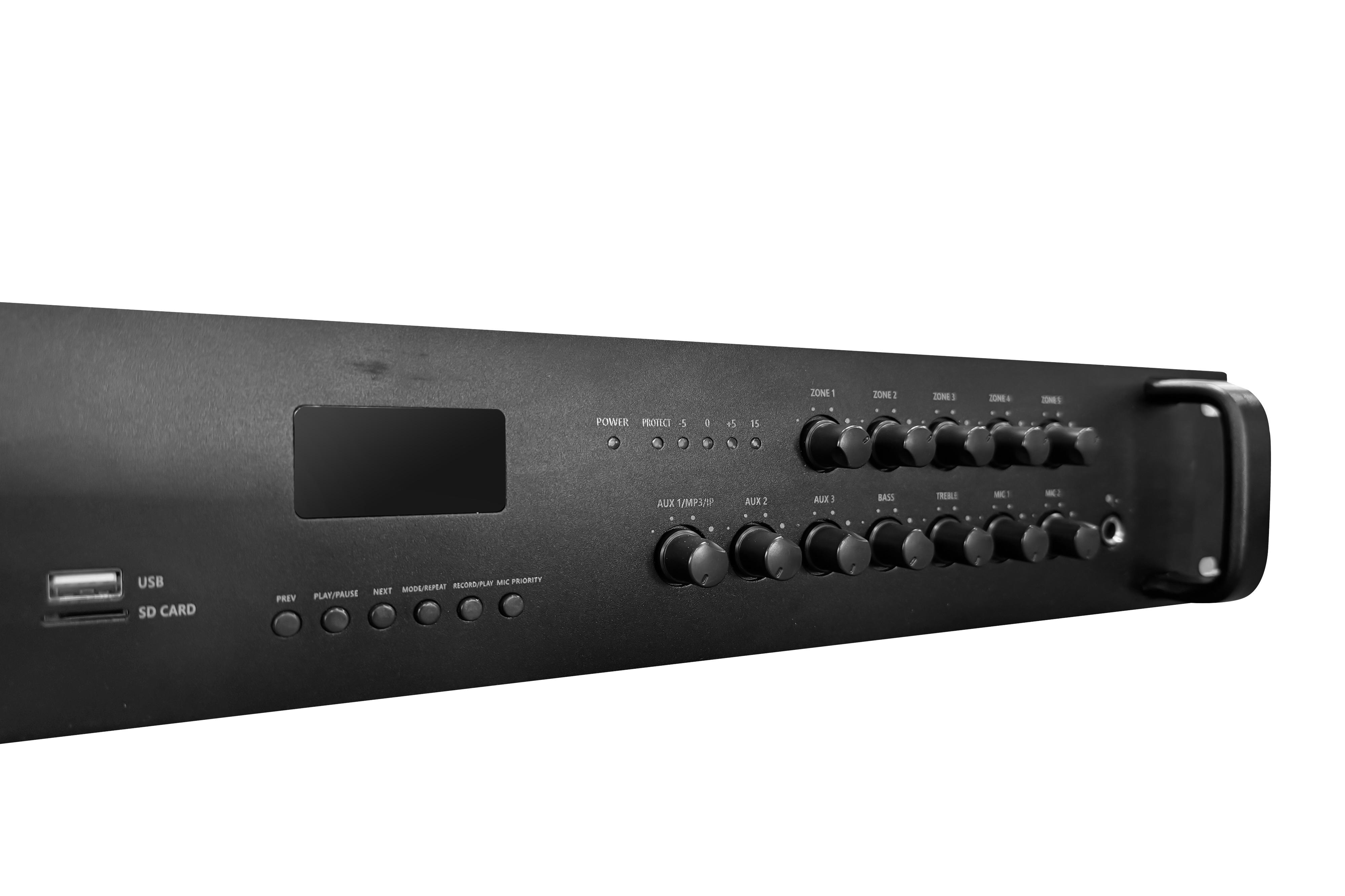 P450 | 450W | 1、5组定压输出(100V)独立6分区调节输出,一路定阻输出(4-16Ω),一路定压输出(70V),一路定压输出(100V) 2、话筒优先开关功能 3、录音/重放功能 4、支持USB播放,三组RCA信号输入,一组RCA前置输出 5、高低音调节 技术参数 1、使用电源:AC220V-240V 50Hz 2、频率响应:20-20KHz 3、信噪比:≥80DB 4、谐波失真:≤0.5% 5、输入灵敏度:550mV 6、高音调节:±14dB(10KHz) 7、低音调节:±14DB(100Hz) |